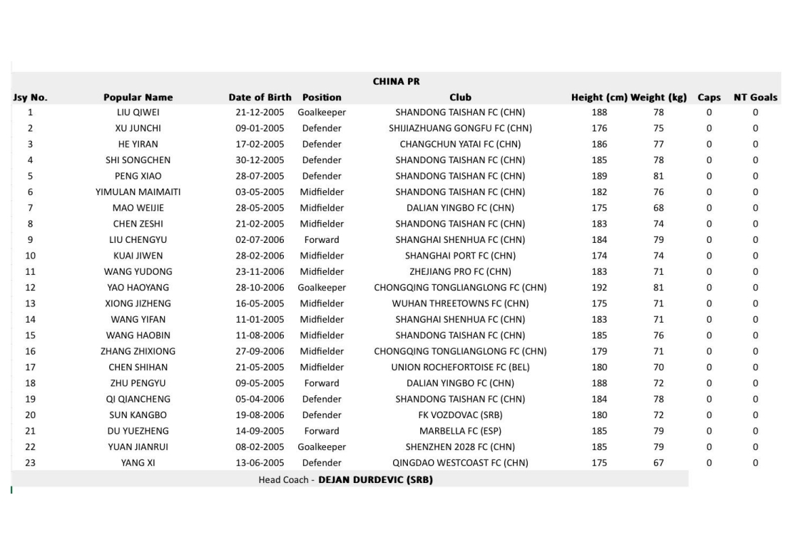 后衛:2-徐俊馳(石家莊功夫)、3-賀一然(長春亞泰)、4-史松宸(山東泰山)、5-彭嘯(山東泰山)、19-齊千程(山東泰山)、20-孫康博(塞爾維亞沃日多瓦茨)、23-楊希(青島西海岸)