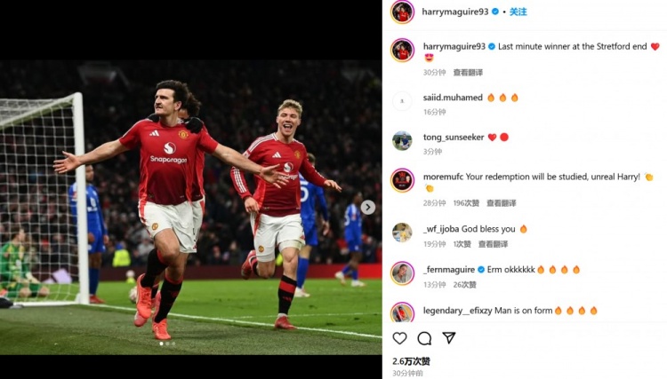 馬奎爾也在賽后通過(guò)社媒曬出自己的慶祝照,并配文:“在老特拉福德最后一刻打進(jìn)制勝球!”
