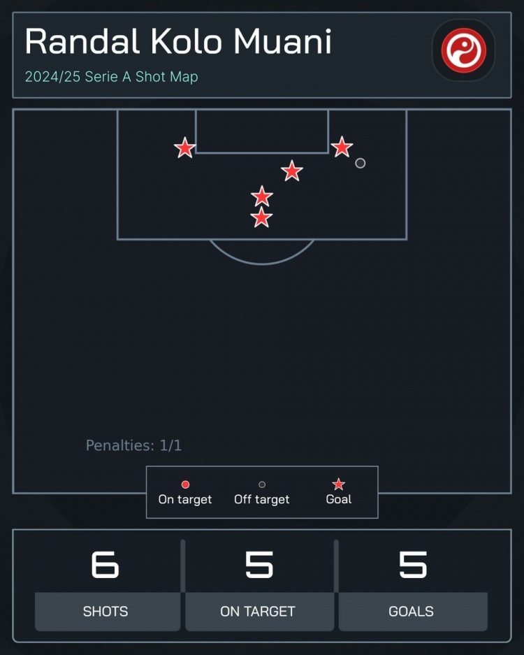 數據統計顯示,穆阿尼為尤文3場意甲打進5球,共計僅射門6次且全部射正。