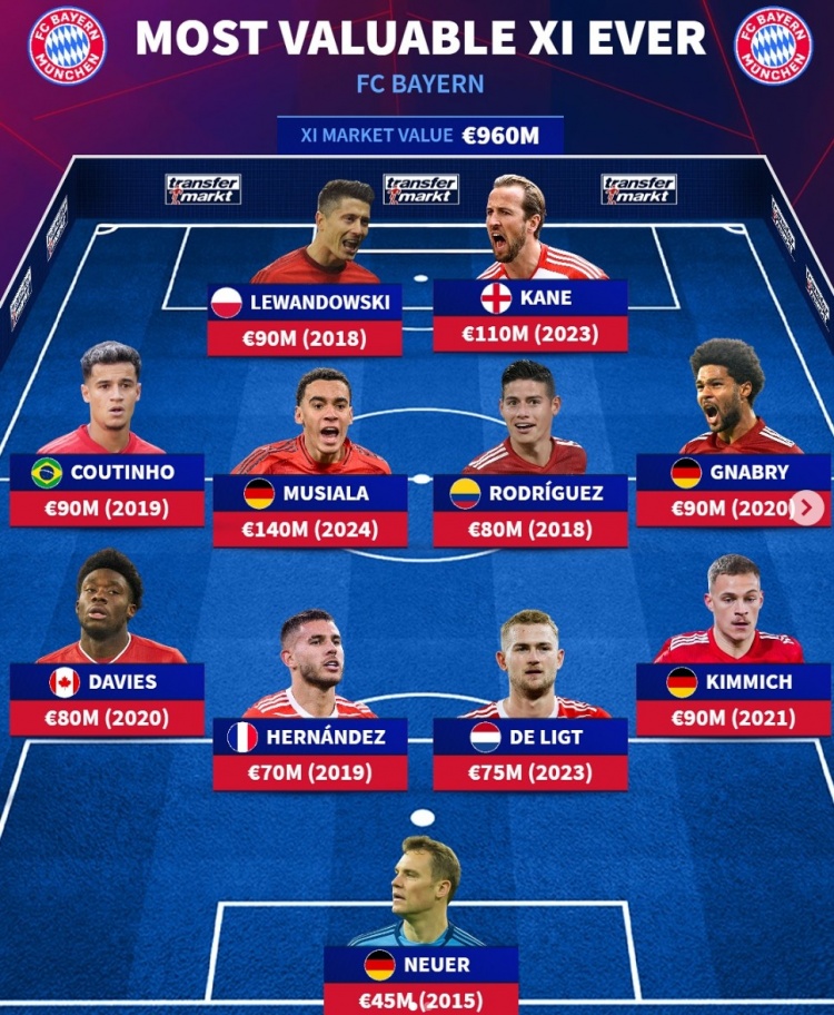德轉列拜仁球員歷史身價最貴陣:總身價9.60億歐元