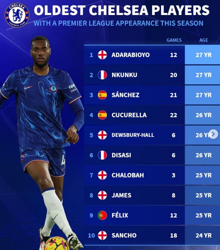 德轉(zhuǎn)列本賽季切爾西英超出場(chǎng)球員年齡最高榜: