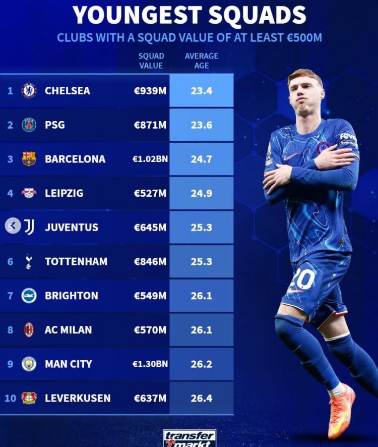 2月9日訊 《轉會市場》統計了身價超過5億歐元的球隊當前陣容平均年齡最年輕榜單,切爾西居首。