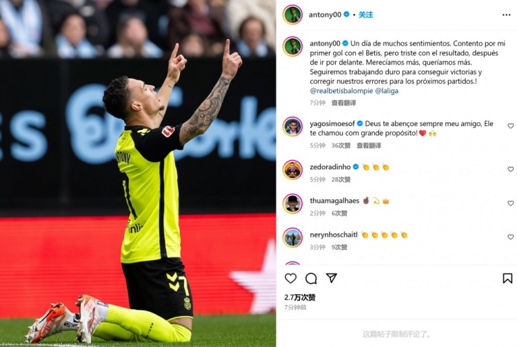 2月9日訊 貝蒂斯在本輪西甲2-3不敵塞爾塔,從曼聯租借而來的安東尼打進首球。比賽第10分鐘,安東尼在禁區內得球,面對防守球員左腿原地擺腿搓射破門。他也在賽后通過社媒曬出自己慶祝進球的照片,并配文:“情緒復雜的一天!為我打進貝蒂斯生涯處子球感到高興,但也為領先后被翻盤而難過。”“我們配得上更好的結果,也想要贏得更多。我們將繼續努力爭取勝利,并在下一場比賽糾正犯下的錯誤。” 本文標簽: 足球 英超 曼聯 西甲 貝蒂斯 塞爾塔