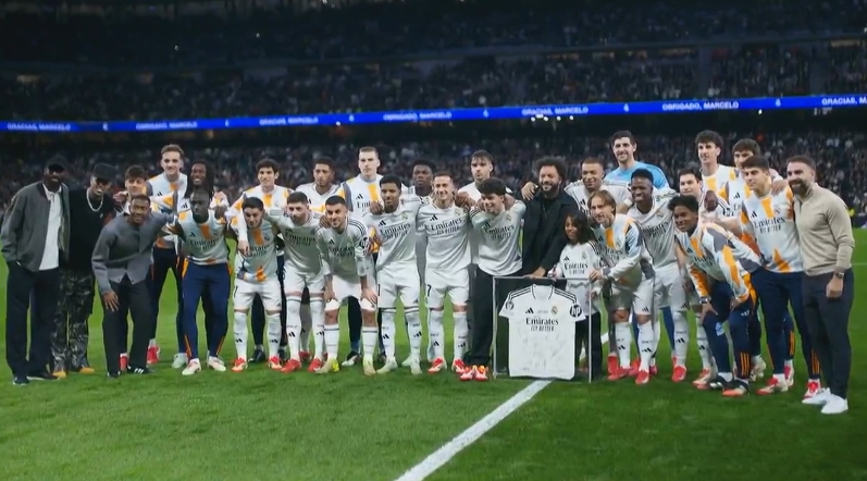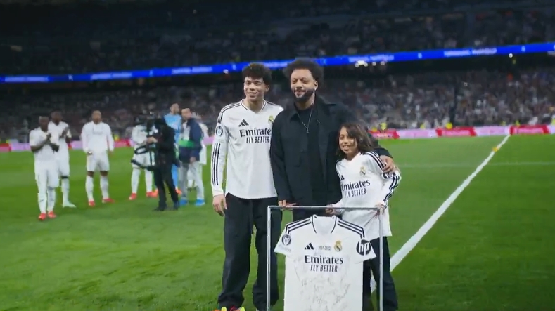 莫德里奇為馬塞洛送上紀(jì)念球衣,皇馬全隊(duì)和現(xiàn)場(chǎng)球迷為他送上掌聲。