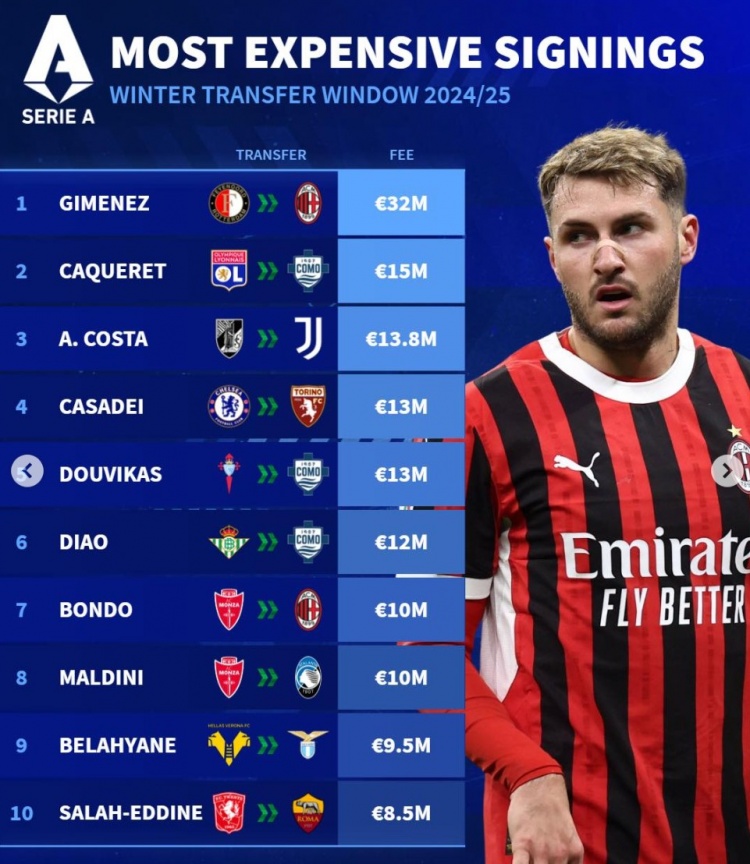 2月10日訊 五大聯賽冬窗已經結束,《轉會市場》也列出了意甲冬窗引援最貴榜單,米蘭中鋒圣地亞哥-希門尼斯領銜。