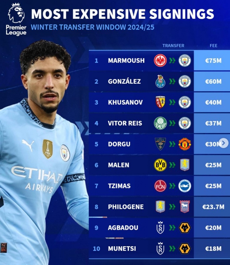 2月10日訊 五大聯賽冬窗已經關閉,《轉會市場》也統計了本賽季英超冬窗最貴轉會榜,曼城獨占前四。