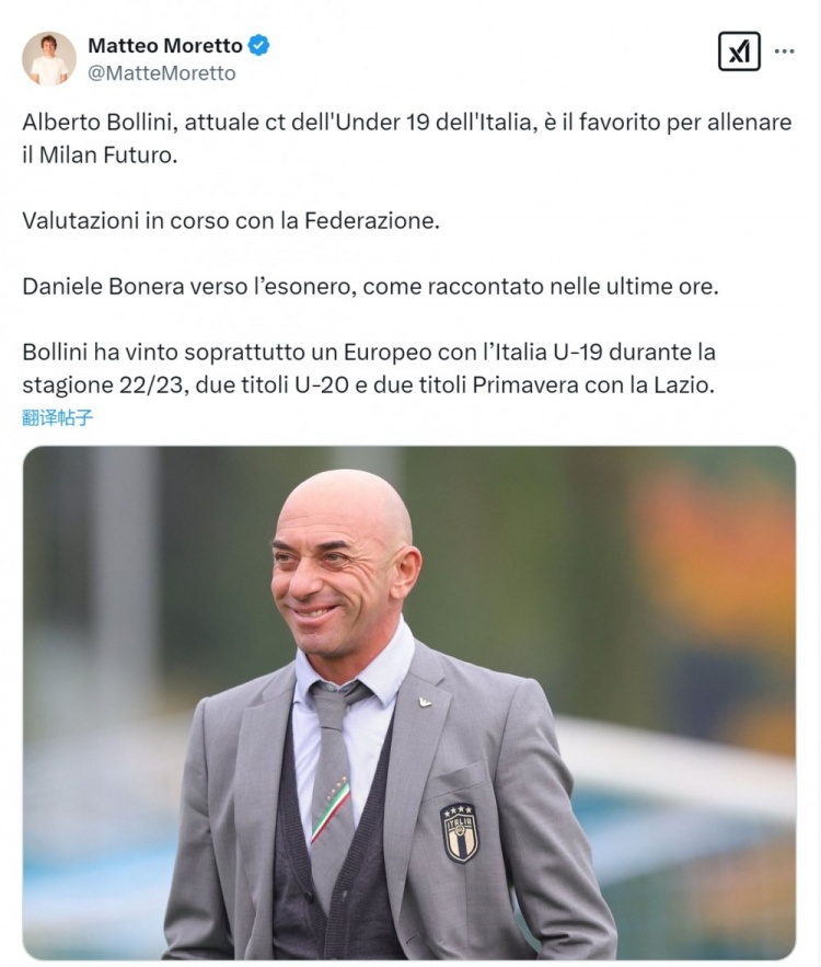 2月10日訊 據記者莫雷托透露,意大利U19青年隊主帥博里尼是米蘭未來隊新帥熱門人選。根據媒體的報道,米蘭未來隊主帥博內拉即將被解雇。莫雷托指出,意大利U19青年隊現任主帥博里尼是接手米蘭未來隊的熱門人選,他正與意大利足協評估未來。博里尼是一位58歲的意大利教練,曾擔任薩勒尼塔納、摩德納主帥,帶領意大利青年隊贏得2023年U19歐洲杯冠軍。 本文標簽: 足球 意甲 AC米蘭