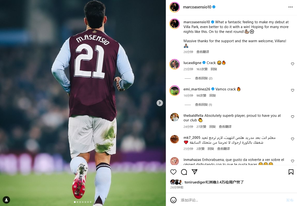 2月10日訊 阿斯頓維拉在本輪足總杯主場2-1擊敗熱刺,從巴黎租借而來的阿森西奧替補完成首秀。他也在賽后通過社媒曬出自己的比賽照,并配文:“在維拉公園的首次亮相真是太棒了,取得勝利讓這感覺更好了!期待未來能有更多這樣的夜晚。晉級下一輪!??????????非常感謝你們的支持和熱烈歡迎,維拉球迷們!” 本文標簽: 足球 英超 熱刺 阿斯頓維拉 法甲 巴黎圣日耳曼