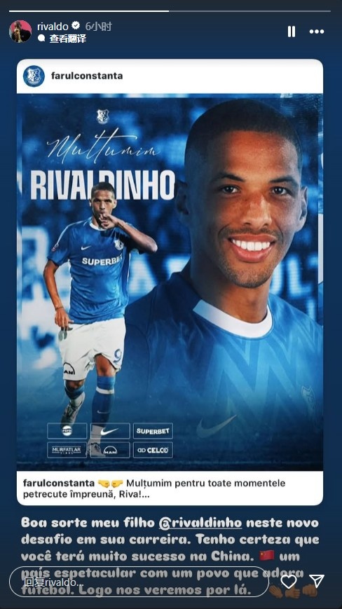 在個人社媒,里瓦爾多曬出里瓦爾迪尼奧加盟青島紅獅的官方照,同時配文:“祝我的兒子在職業生涯的新挑戰中好運,我相信你在中國一定會成功,中國是一個有著熱愛足球的人民的國家,很快就會見面。”