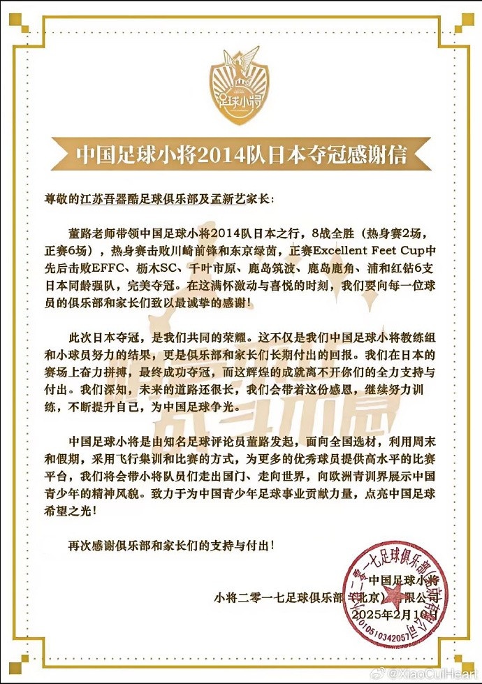 2月11日訊 前往日本參加杯賽的中國(guó)足球小將2014年齡段隊(duì)先后擊敗日本同齡強(qiáng)隊(duì)順利奪冠,賽后中國(guó)足球小將2014年齡段隊(duì)發(fā)布了感謝信。