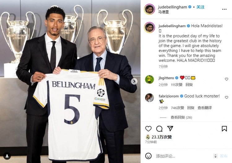 2023年夏天,貝林厄姆加盟皇馬,穿上了偶像齊達(dá)內(nèi)在皇馬穿過(guò)的五號(hào)球衣。那一天,接受采訪的貝林厄姆非常激動(dòng)地說(shuō),齊達(dá)內(nèi)是他的偶像,能夠在皇馬和偶像穿同樣號(hào)碼的球衣,他非常感動(dòng),希望自己能夠成為皇馬新五號(hào)。