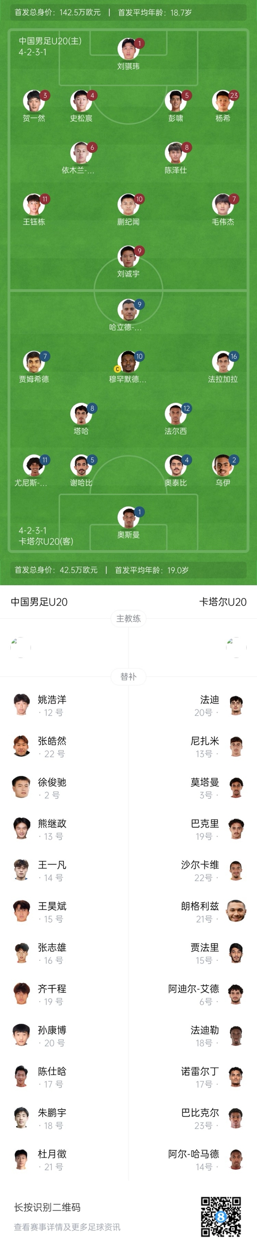 卡塔爾U20首發:1-阿布貝克爾-奧斯曼、2-阿尤布-烏伊、4-奧泰比、5-謝哈比、11-尤尼斯-巴拉、12-法爾西、8-塔哈、10-易卜拉欣-穆罕默德-阿里、7-賈姆希德、9-古達、16-法拉加拉