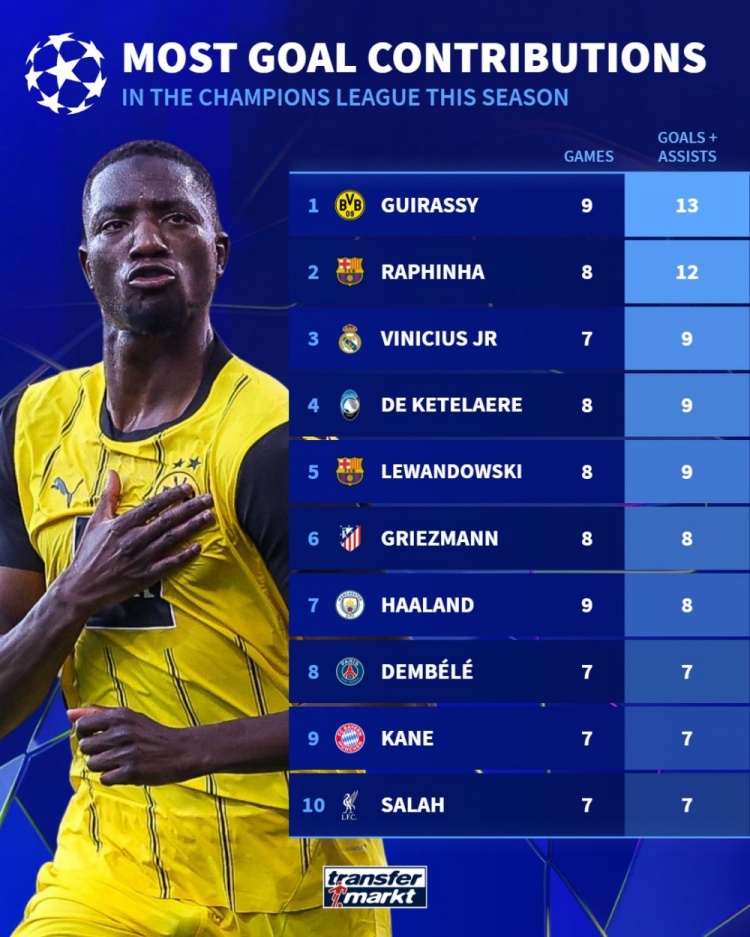 2月12日訊 德國轉會市場統計了本賽季球員在歐冠比賽中參與進球的數量,并列出榜單,吉拉西參與13球居首,拉菲尼亞參與12球次席。