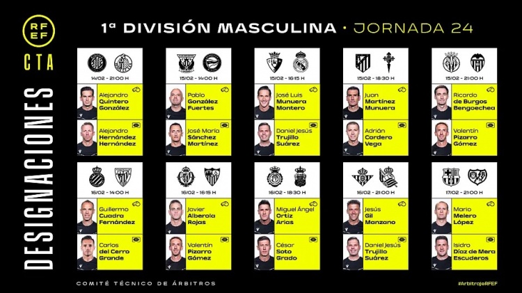2月13日訊 西班牙足協今日公布了西甲第24輪各場比賽的裁判安排,具體如下: