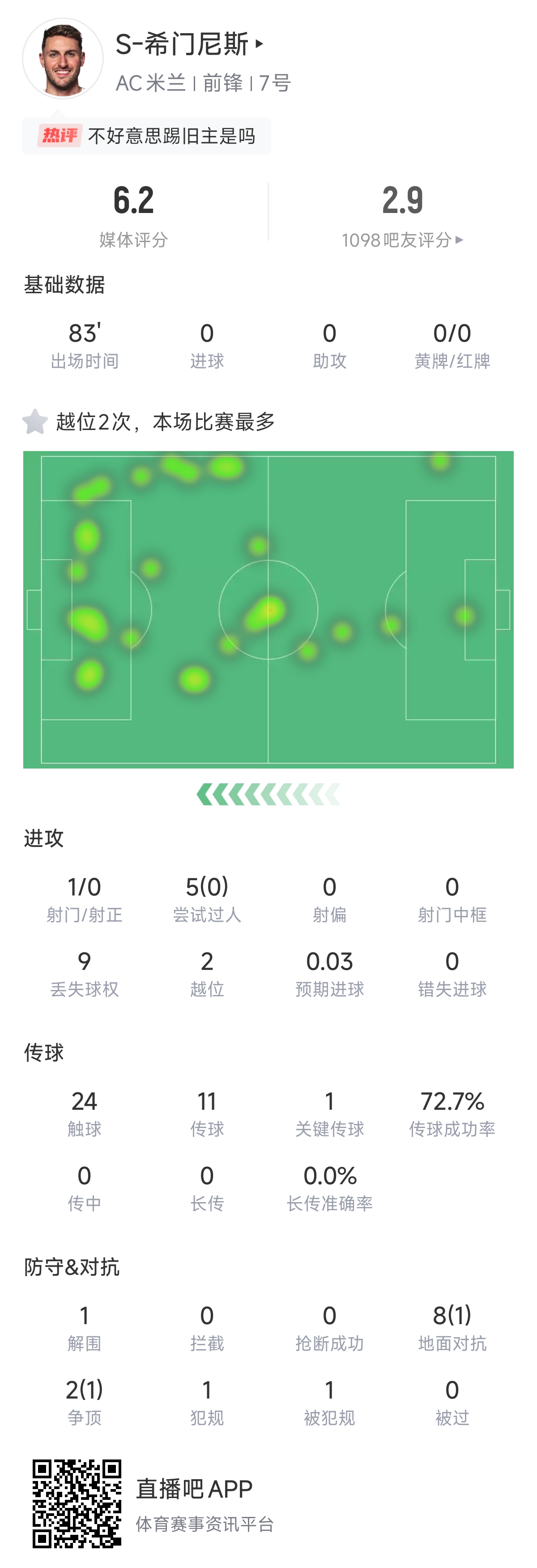本場(chǎng)對(duì)陣舊主,希門尼斯出戰(zhàn)83分鐘僅有1腳射門,沒有射正。他5次過人0成功,8次對(duì)抗1成功,還有2次越位。在24次觸球的數(shù)據(jù)中,希門尼斯9次丟球權(quán),11次傳球72%成功率,包含一次關(guān)鍵傳球。