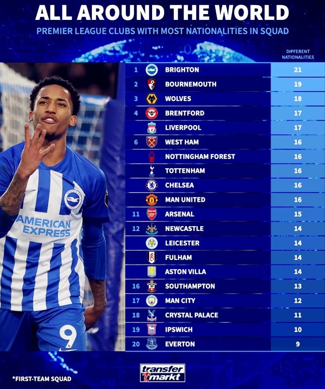 上賽季,布萊頓一線隊的球員來自21個國家。